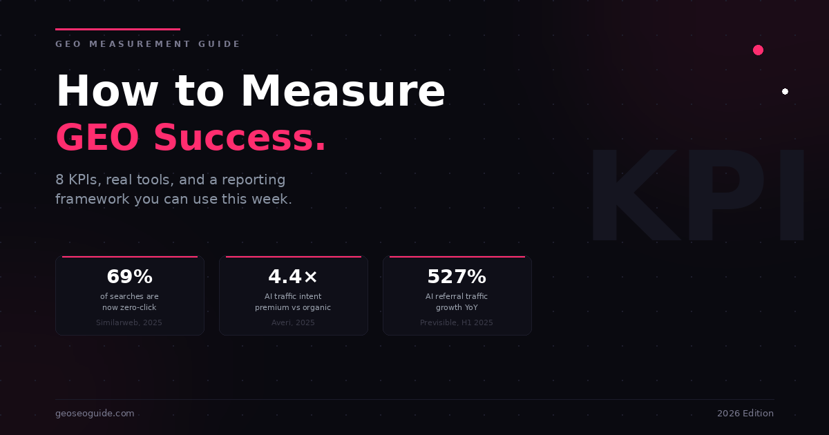 Learn the 8 essential KPIs for measuring Generative Engine Optimization success, from AI visibility rate to citation quality. Includes tools at every budget and a ready-to-use reporting framework.
