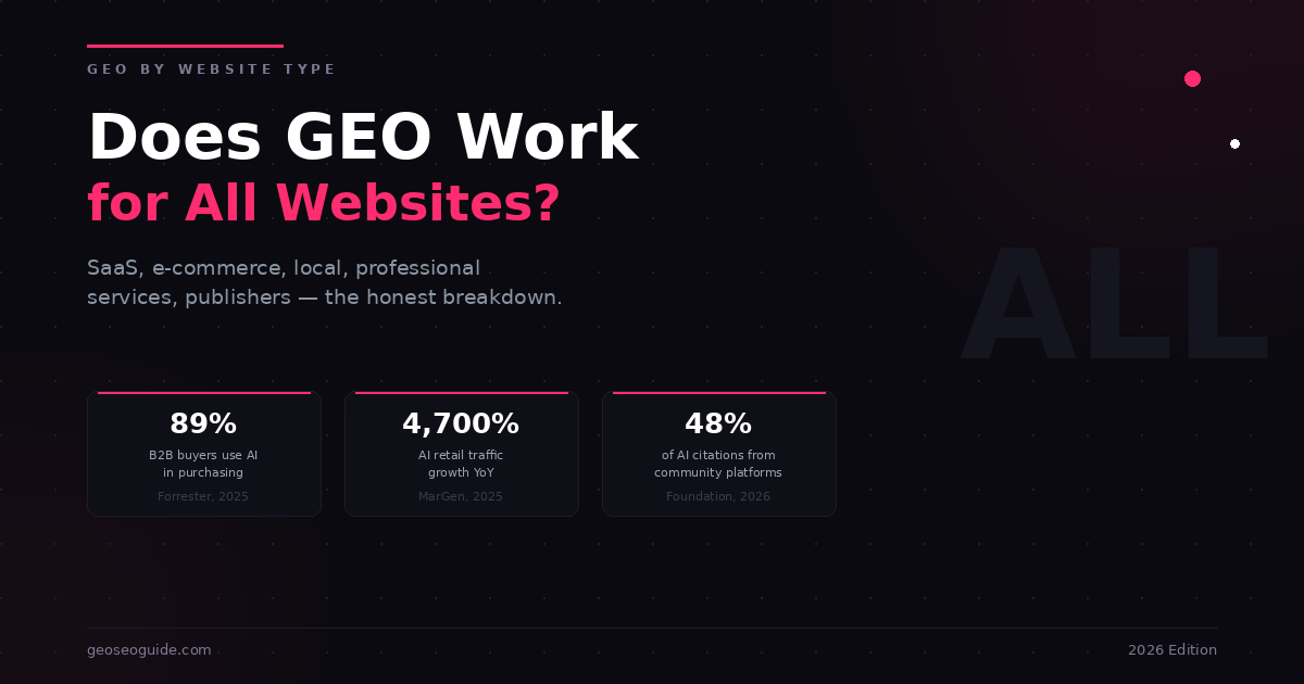 But here’s the longer, more honest answer: GEO works for all types of websites, but the strategy, priority level, expected timeline, and ROI differ significantly depending on your business model. A B2B SaaS company with a long sales cycle will approach GEO very differently from a local plumber. Both can benefit. Neither should copy the other’s playbook.